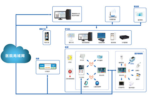 智能医护通讯系统采用现代通信与信息技术,以IP网络通信为基础,无线移动通信和物联网技术为扩展,将呼叫对讲、信息服务、临床提醒等服务融为一体,通过智慧病区数据清洗系统实现医院各个临床应用系统互联、信息一体化。智能医护通讯系统硬件包括医护主机、病房分机、病床分机、LCD中文显示屏、四色告警门灯、卫生间防水分机等。